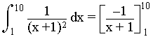 [click on Summary button of aMath96 toolbar] [Integral selection] [entering 1, 10 and 1/(x + 1) dx in the dialog box] [shift + left arrow] [shift + F9 entering the formula to be filled] [entering the exponent 2] [fraction transformation] [shift + F9] = -[F3]1/x + 1[shift + 8 left arrow] [alt + F] [alt + shift + ( ] [click on SubAndSuperScript button] [entering 1 and 10 and position ajustment]